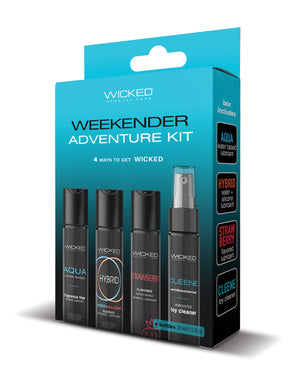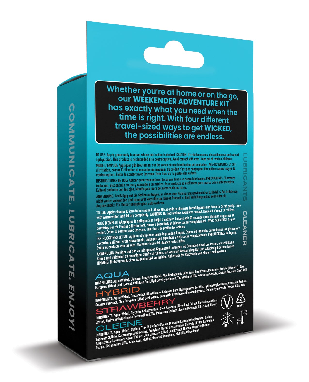 Take pleasure on the go with the Wicked Sensual Care Weekender Adventure Kit. This travel-friendly set includes four mini essentials—Aqua water-based lube, Hybrid, Strawberry flavored lube, and Cleene antibacterial spray toy cleaner. Perfect for romantic getaways or spontaneous adventures, this compact collection ensures you’re always ready to get Wicked wherever the weekend takes you.