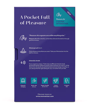 Compact sized clitoral stimulator for people seeking the unique sensations of Pleasure Air Technology. The new Womanizer STARLET 3 – it’s the original Womanizer Pleasure Air Technology combined with five new vivid product colors and two more intensity levels, while it’s still waterproof and USB rechargeable – for a reasonable price. 6 intensity levels - Every orgasm is unique. That's why six different intensity levels guarantee perfect pleasure exactly when and how you want it. The intensity levels are perfectly balanced and offer the right setting for your every mood. Body fit - The sensual, slim design fits comfortably in your hand and becomes the perfect companion for even the most intimate moments.IPX7 Waterproof - You want to dive deeper? Since your WOMANIZER is IPX7 waterproof, nothing stands in the way of a long, relaxing bath, a refreshing shower or even a pool party. Materials : ABS plastic made without phthalates, BPA or latex. Dimensions : 117mm x 46mm x 47mm USB rechargeable - Run Time : 30 min Charge Time : 30 min Five Year Warranty.