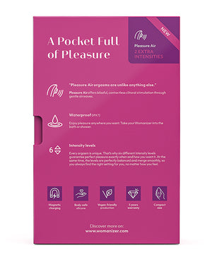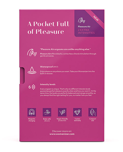 Compact sized clitoral stimulator for people seeking the unique sensations of Pleasure Air Technology. The new Womanizer STARLET 3 – it’s the original Womanizer Pleasure Air Technology combined with five new vivid product colors and two more intensity levels, while it’s still waterproof and USB rechargeable – for a reasonable price. 6 intensity levels - Every orgasm is unique. That's why six different intensity levels guarantee perfect pleasure exactly when and how you want it. The intensity levels are perfectly balanced and offer the right setting for your every mood. Body fit - The sensual, slim design fits comfortably in your hand and becomes the perfect companion for even the most intimate moments.IPX7 Waterproof - You want to dive deeper? Since your WOMANIZER is IPX7 waterproof, nothing stands in the way of a long, relaxing bath, a refreshing shower or even a pool party. Materials : ABS plastic made without phthalates, BPA or latex. Dimensions : 117mm x 46mm x 47mm USB rechargeable - Run Time : 30 min Charge Time : 30 min Five Year Warranty.