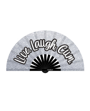 Cool yourself in style with this “Live Laugh Cum” large-sized folding hand fan. Simple and fun with just the right attitude! Made of glossy bamboo ribs and high-quality satin material.