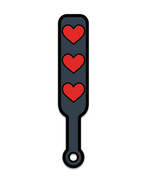 This fun soft enamel lapel pin by Wood Rocket is the perfect accessory. Wear your sex product pride! This paddle Sex Toy Pin is black with red hearts and looks just like a fetish BDSM paddle that says Daddy but it's tiny! Stick it on your hat or clothes or backpack or bag or purse it or give it as a gift!