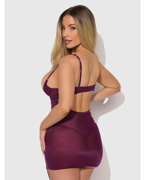 Yasmine Shimmer Mesh O-Ring Thigh Garter Chemise & G-String Set - Burgundy SM