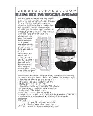 Double your pleasure with two erotic entries in one versatile stroker! Choose from a life-like vaginal entry or a classic round hole shape and enjoy the textured, ribbed channel that cradles you in all the right places for a nice, tight fit! Complete the fantasy with free lube and a free movie download from Zero Tolerance Entertainment and get the satisfaction you deserve every time you reach for this two-in-one toy. Each end is capped with a sturdy cover that keeps it safe between uses, and the jelly insides pop out to clean thoroughly.