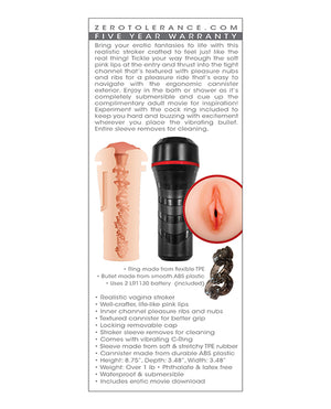 Bring your erotic fantasies to life with this realistic stroker crafted to feel just like the real thing! Tickle your way through the soft pink lips at the entry and thrust into the tight channel that’s textured with pleasure nubs and ribs for a pleasure ride that’s easy to navigate with the ergonomic cannister exterior. Enjoy in the bath or shower as it’s completely submersible and cue up the complimentary adult movie for inspiration! Experiment with the cock ring included to keep you hard and buzzing with excitement wherever you place the vibrating bullet. Entire sleeve removes for cleaning. Five Year Warranty.