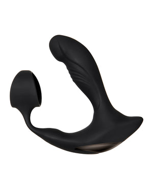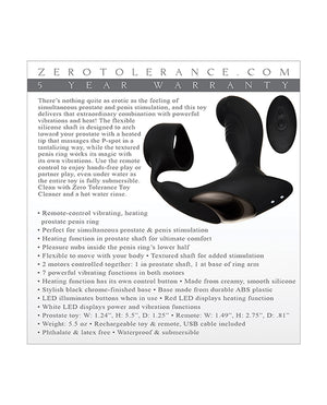 There's nothing quite as erotic as the feeling of simultaneous prostate and penis stimulation, and this toy delivers that extraordinary combination with powerful vibrations and heat! The flexible silicone shaft is designed to arch toward your prostate with a heated tip that massages the P-spot in a tantalizing way, while the textured penis ring works its magic with its own vibrations. Use the remote control to enjoy hands-free play or partner play, even under water as the entire toy is fully submersible. Clean with ZT Toy Cleaner and a hot water rinse.