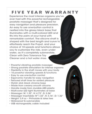 Experience the most intense orgasms you’ve ever had with this powerful rechargeable prostate massager that’s designed for easy navigation and pleasure precision. An easy to use one-button control is nestled into the glossy black base that illuminates with a multi-colored LED and fits into the palm of your hand with remarkable comfort. The silicone shaft is shaped with the best length and curve to effortlessly reach the P-spot, and your choice of 10 speeds and functions allows you to customize the ride, even under water, as it’s completely submersible. Clean with ZT Toy Cleaner and a hot water rinse.
