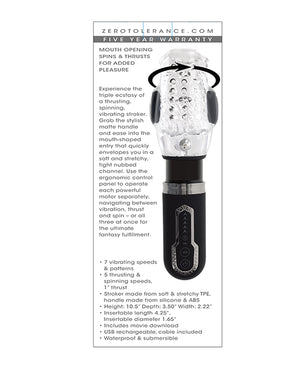 Experience the triple ecstasy of a thrusting, spinning, vibrating stroker. Grab the stylish matte handle and ease into the mouth-shaped entry that quickly envelopes you in a soft and stretchy, tight nubbed channel. Use the ergonomic control panel to operate each powerful motor separately, navigating between vibration, thrust and spin – or all three at once for the ultimate fantasy fulfillment. Five Year Warranty.